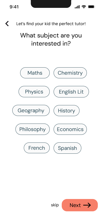 In the app, I added a call-to-action button on the homepage that says “start booking” and that takes the user to the start of the booking flow. I also added “or browse tutors” as a cue to scroll through tutors as an alternative